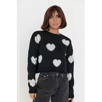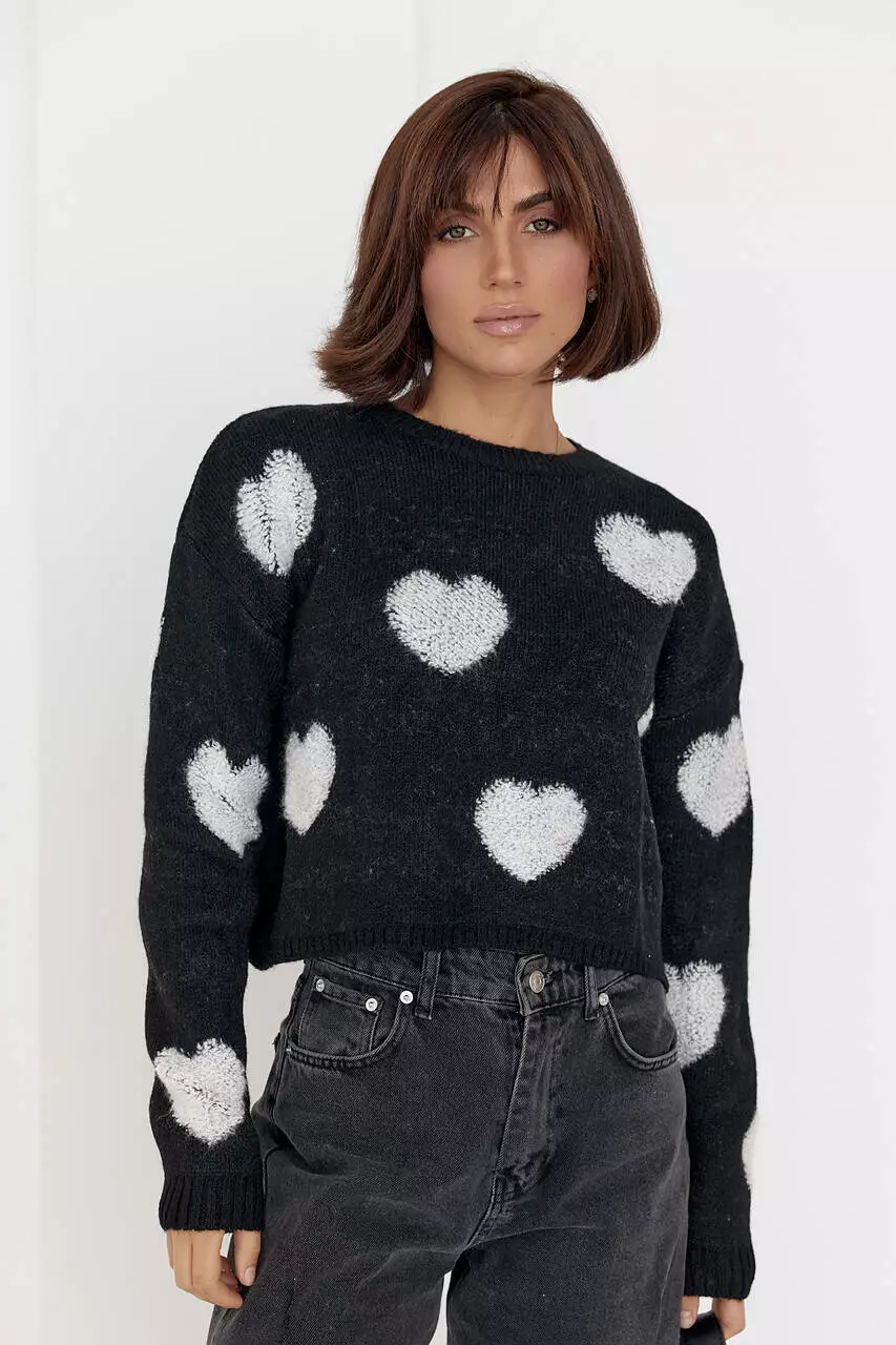 Чтобы наряд с базовыми вещами выглядел модно, достаточно добавить в образ одну трендовую вещь. Например, этот красивый джемпер с сердцами.