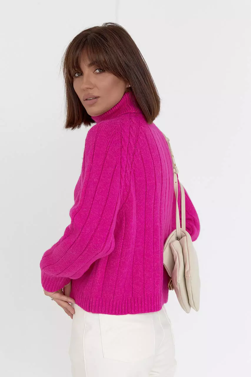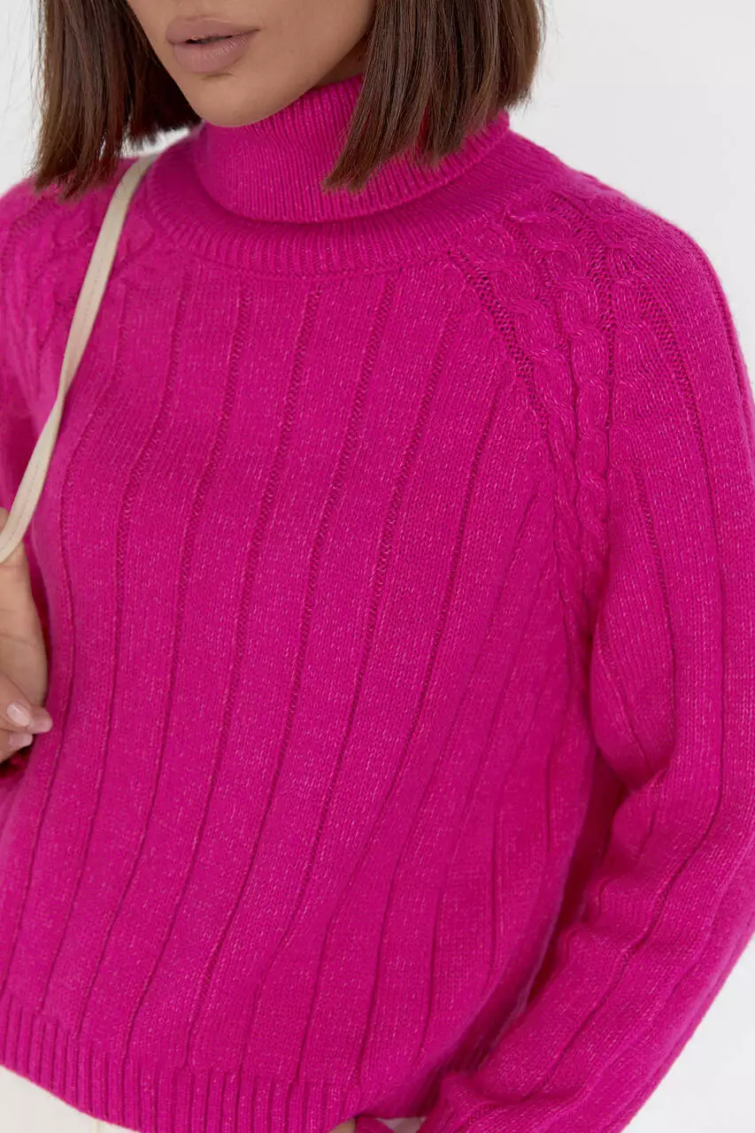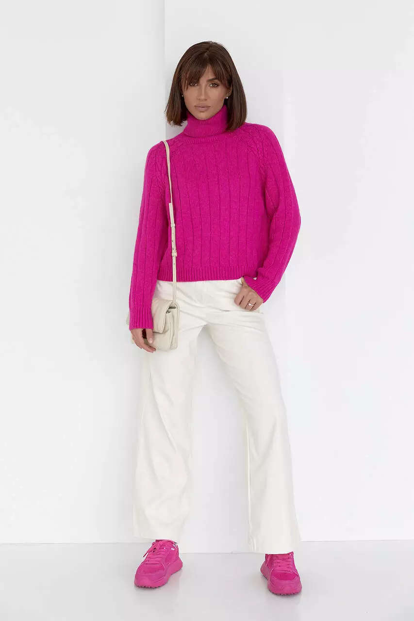 Прямой низ и рукава заканчиваются вязкой в виде манжет, а круглая