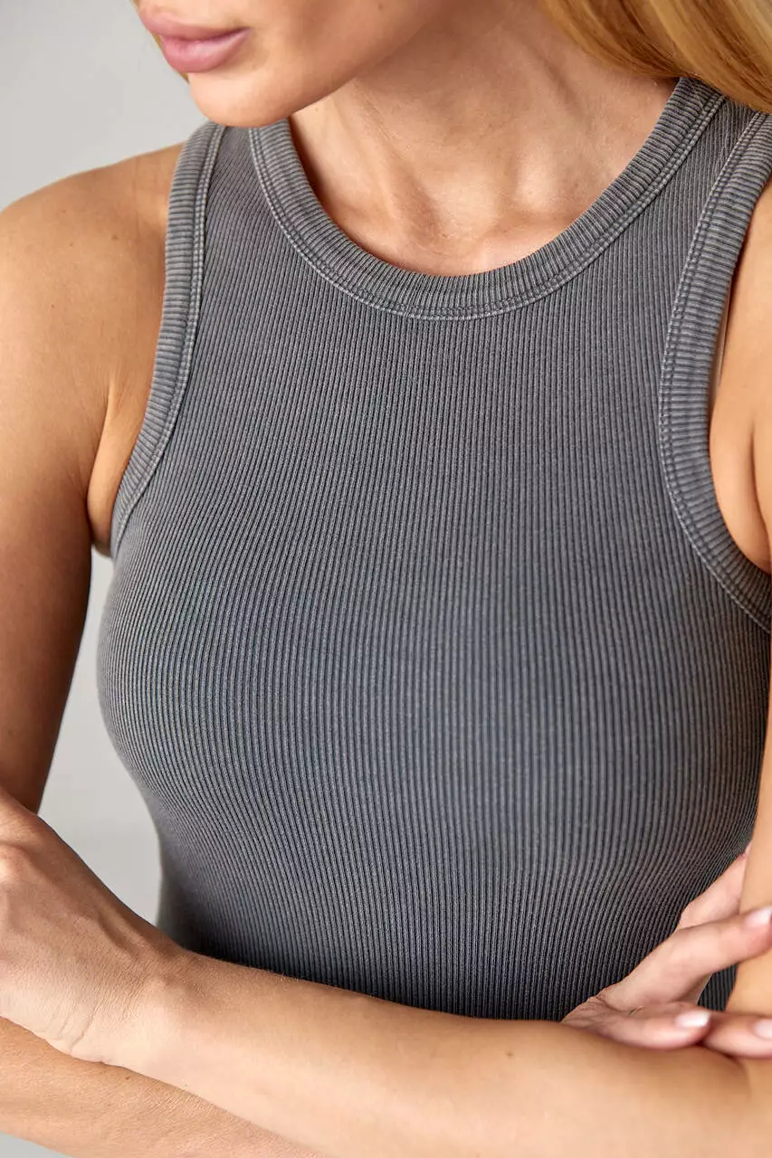 Эта модель выполнена из трикотажа в мелкий рубчик. Линия низа в изделии прямая, а круглая горловина и проймы обшиты узкой окантовкой.
